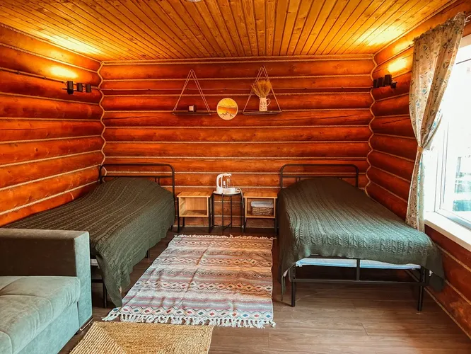 Размещение в благоустроенных домиках с удобствами в туркомплексе.
